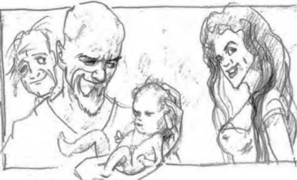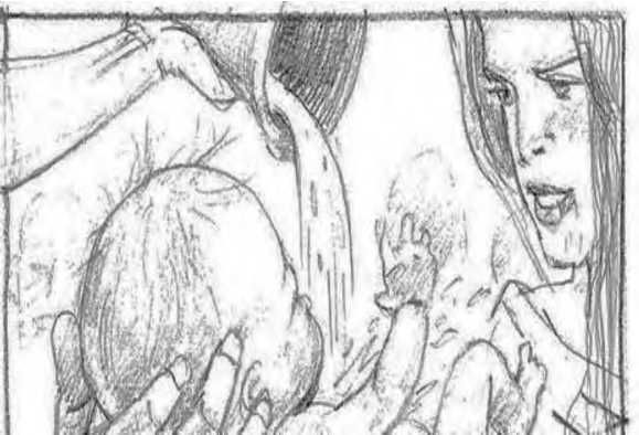 «Повитуха» зубами перекусила пуповину. Уверенными движениями завязала пупок и, вставая, подняла ребёнка на вытянутых руках. У рождённого торчал писун большого размера.