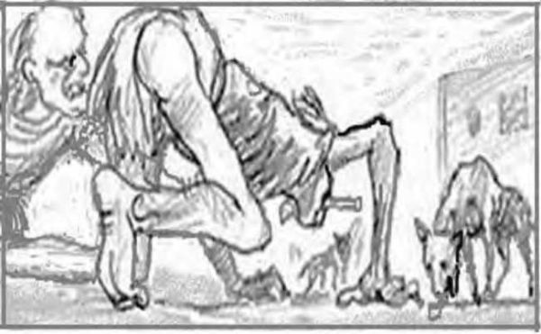 Слепец «без мозгов» прислушался, как «музыкант» хрустит зубами, обрабатывая хрящи. Изловчившись, он выхватил кость и с жадностью стал её обгладывать.