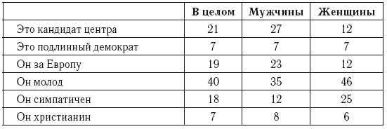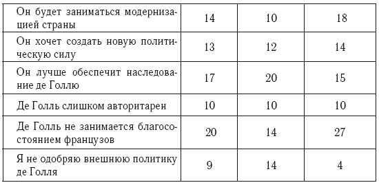 Такая корреляция находит подтверждение в опросах, приводимых, в частности, в довольно информированной работе Ж. Сюттера. Можно сослаться на два показательных опроса. Первый касается мотивов голосования за Ж. Леканюэ в первом туре президентских выборов 1965 г. (опрос был проведен 13 и 20 декабря 1965 г.). На вопрос – «Вы голосовали за Ж. Леканюэ, потому что…» – ответы распределились следующим образом: