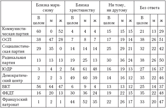 Социолог А. Мандра иллюстрирует произошедшие изменения: «Закат католической церкви объясняется по большей части исчезновением крестьянства. Также как закат Коммунистической партии объясняется исчезновением пролетариата. Но этого объяснения недостаточно, так как «дехристианизированные» крестьянские регионы были географически не менее протяженными, как и практикующие регионы. В значительной части нерелигиозная и вольтерьянская буржуазия начала XIX века повернулась к церкви в его середине, в частности, вследствие революции 1848 года. Сегодня она в большинстве снова отдалилась от церкви. Ни старые средние, ни новые классы в своей массе не поддерживали ее духовное влияние. Никакое миссионерское движение, сравнимое по важности с JAC [Jeunesse agricole chretienne. – Д.Ш.] или JOC [Jeunesse ouvriere chretienne. – Д.Ш.], не попыталось их христианизировать… Церковь, слишком занятая сохранением буржуазии и крестьянства и завоеванием рабочих, не видела своего будущего, как и будущего общества, в том, чтобы быть связанными с новыми средними классами. Пресса остается единственным средством, которое она дала, чтобы их завоевать»[77]. Тем не менее, несмотря на закат религиозной практики, религия оставалась важным фактором, через который можно объяснить идеологические и политические разломы французского общества, поскольку, по мнению А. Мандра, «религиозная ориентация является лучшим индикатором предрасположенности голосования за правых»[78]. Иными словами, как и в довоенные годы, отношение к религии остается важным фактором политической ангажированности французских католиков. Традиционно религиозный вопрос предопределял их позиционирование справа, несмотря на всю условность такого деления. В то же время секуляризация и эволюция французского общества вносили сильное разнообразие в отношение к религии и регулярность религиозной практики. Кроме того, вопрос религиозности теперь находился в прямой зависимости от поведения церковной иерархии.