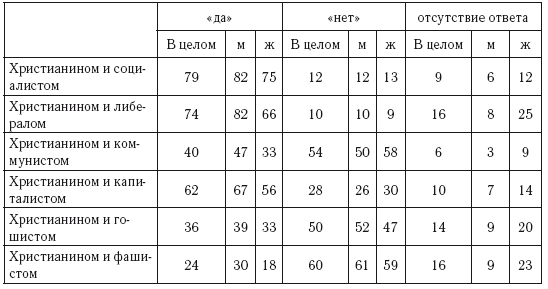 Опрос 4. «Можно ли, по вашему мнению, быть христианином и сторонником социалистического общества?»: «да» ответили 77 %, «нет» – 11 %, остались без ответа – 12 %.