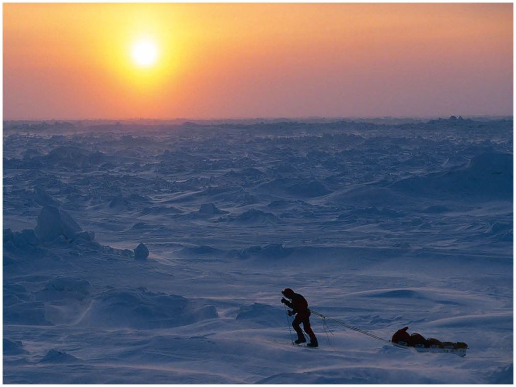 В 1990 году, в последних числах февраля, на леднике, сползающем с холма острова Большевик в Карское море (а это и есть мыс Арктический), я провожал в путь к Северному полюсу двух англичан – сэра Рэналфа Файннеса и доктора Майка Страуда. Могучие парни шли с непомерным грузом – они надеялись дойти до полюса без поддержки с воздуха. Начав от земли, несколько метров они балансировали на серых прожилках твердого льда, будто вмонтированного в черный нилас (лед толщиной несколько сантиметров). Успешно. Дальше лежали распрекрасные ровные белые льды. Разведка на вертолете не сулила моим друзьям на ближайшее время никаких водных преград.