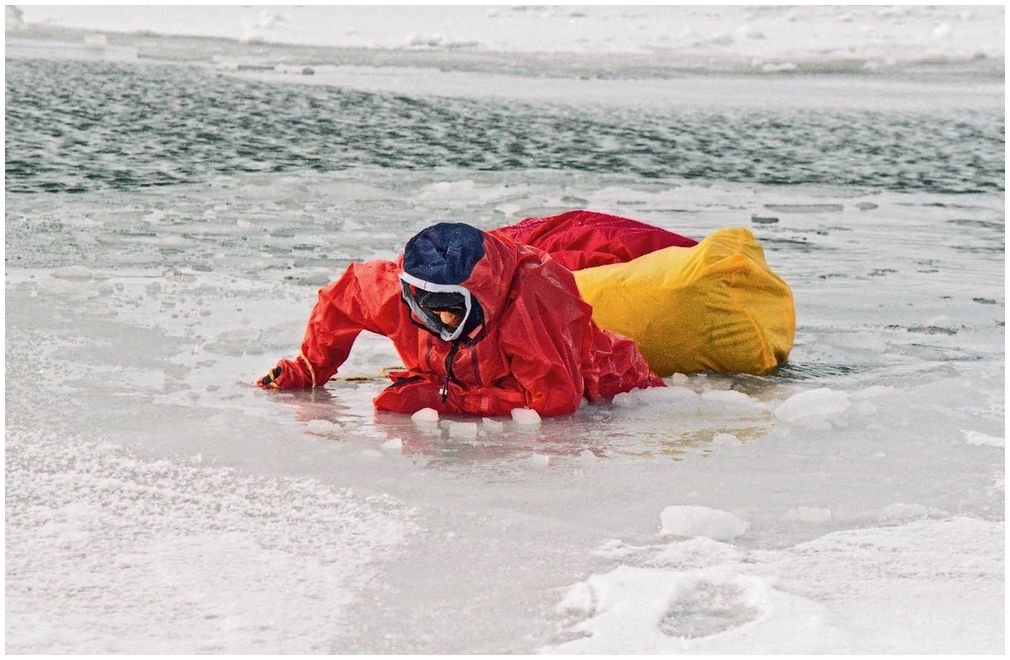 Борис Смолин переплывает полынью в специальном гидрокостюме