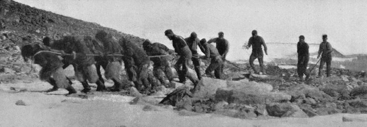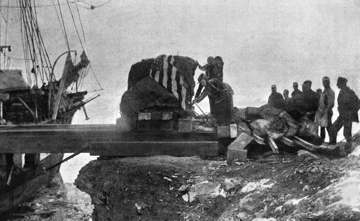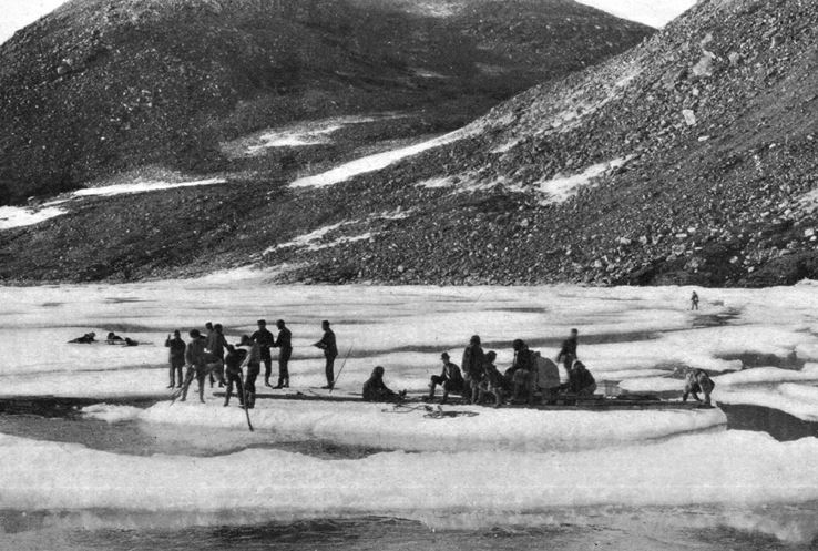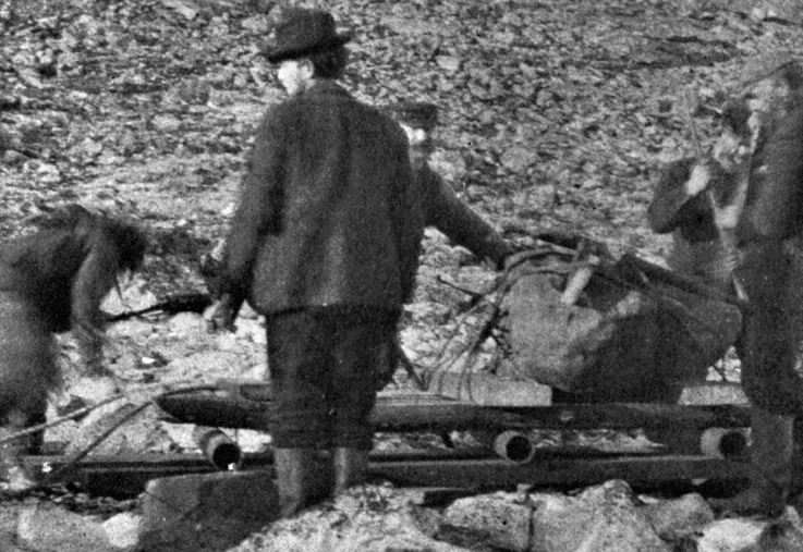 На следующий день Дибич с командой корабля и эскимосами начал работу. С помощью домкратов «женщину» подняли с места, а для «собаки» были сооружены грубые сани из еловых жердей. На второй день «женщина» была закреплена и готова к транспортировке, а «собаку» закатили на сани и общими силами корабельной команды и моих местных союзников стали тащить через валуны и потом вниз по сугробам к берегу; затем ее переправили через открытую воду на льдине и, наконец, тянули около мили по льду залива до корабля, где подняли на борт и уложили в трюме.