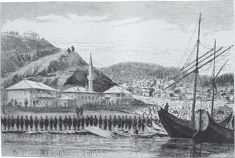 В Рущуке встретили Великого Князя генерал-губернатор округа и наш консул. По ступеням, от пристани к берегу, были расставлены шпалерою солдаты. Пехота с ружьями, артиллеристы и моряки с тесаками. Это была наша первая встреча с турецким воинством; потом мы имели случай познакомиться с ним поближе, во время путешествия по Сирии и Палестине; и – признаюсь, я стал смотреть на турецкого солдата с большим уважением, заметив в нем прекрасные качества и, между прочим, способность безропотно переносить трудности похода и голод. По-видимому, самую слабую сторону турецкой армии составляют офицеры, высшее начальство и администрация. Но об этом в свое время. Замечу только, что вся турецкая армия одета в одинаковую форму без различия родов оружия; костюм турецкого солдата составляют: синего сукна курточка, жилет, застегиваюшийся сзади, в роде наших супервестов, шаровары ниже колена, плотно облегающие икру, кожаные башмаки в пехоте и артиллерии, и высокие сапоги в кавалерии. Все платье обшито красною тесьмой. Только у моряков вместо синего цвета – белый; но головной убор одинаков у всех – это красная феска, без всяких отличий от паши до рядового.