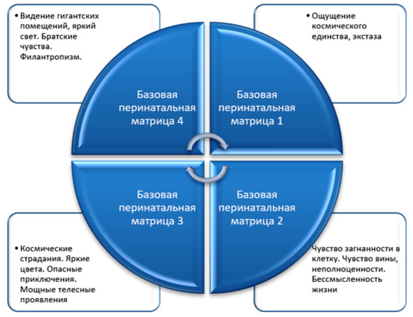 Он назвал такую модель «базовыми перинатальными матрицами» (лат. peri – около, лат. natalis – относящийся к рождению, лат. matrix – первопричина). Согласно этой модели, во время внутриутробного развития и родов человек переживает особый опыт, который, в том числе, может быть связан с так называемой «родовой травмой». Гроф считал, что перинатальные матрицы оказывают влияние на всю последующую жизнь и могут быть причиной различных психических явлений.