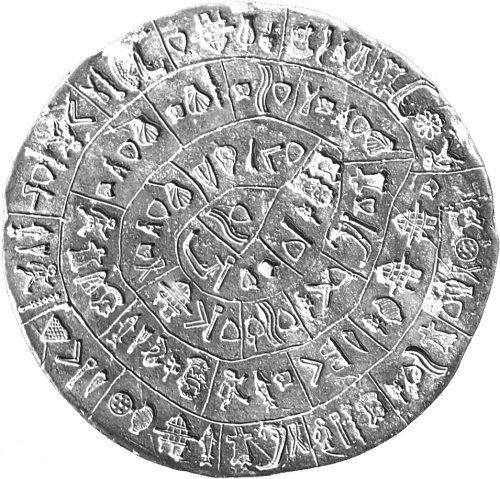 Величайшее достижение древнего человека – изобретение письменности и счета. Считается, что они появились в середине IV тысячелетия до н. э. в Междуречье и принадлежат шумерам [6]. Примерно в это же время или чуть позже они появились и в Древнем Египте. Хотя есть смелые предположения, что зачатки письменности датируются верхним палеолитом и обнаружены они в пещерах на территории современной Франции. Причем, как утверждается, знаки, обнаруженные на рогах оленя, похожи на финикийский и древнегреческий алфавиты [3]. В любом случае, сначала письменность развивалась от пиктографических значков, где угадывались отдельные предметы, до идеографических (греч. idea – идея) или логографических (греч. logos – слово). В настоящее время разновидность последних двух, иероглифическая письменность, сохранилась наиболее полно в Китае. Характерные примеры пиктографических знаков, помимо шумерских и египетских представлены (рис. 2.1) в письменности Мохенджо Даро (III тыс. до н. э.) [7] и на Фестском диске (рис. 2.2) минойской цивилизации (II тыс. до н. э.). Несмотря на кажущуюся простоту пиктографического письма Мохенджо Даро ее начали расшифровывать только во второй половине XX века, а Фестский диск непонятен до сих пор.