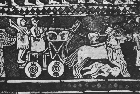 Рис. 2.4. Шумерская боевая повозка. Мозаика из царских гробниц г. Ур. Около 2500 г. до н. э.