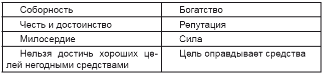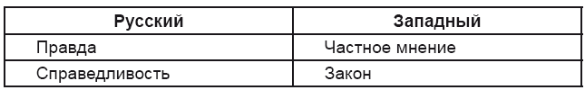 Не будем погружаться в философские дебри. Начнем сразу с менталитета. Приведем таблицу, в которой укажем основные ценности Западного и Русского мира. Причем напротив каждой ценности одного мира будем писать ценность другого, которая ей соответствует.