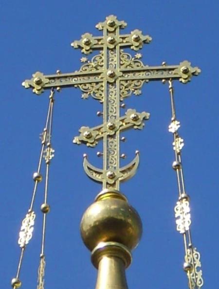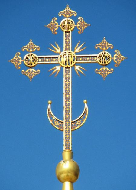 На пересечении перекладин у старых крестов часто присутствует «лежачий полумесяц». В некоторых случаях он замещает собой косую перекладину внизу («мерило праведное»), а иногда располагается наряду с ней, только ниже. Это можно видеть, в частности, на куполах многих православных церквей (Рис. 5, Рис. 6). О том, что именно обозначает «полумесяц», четкого понимания нет. Некоторые ученые, приводя в доказательство некие якобы средневековые тексты, утверждают, что это «ясли Вифлеемские, принявшие в себя младенца Иисуса», другие говорят, что это евхаристическая чаша, третьи намекают на бывшее единство христианство и ислама, четвертые возводят «полумесяц» к византийской государственной символике, где османы его и позаимствовали. Приверженцы семиотики полагают, что полумесяц – это на самом деле не полумесяц, а кораблик, крест же – это парус. В целом же корабль с парусом символизирует Церковь, которая плывет к спасению. Как видим, все эти объяснения совершенно очевидно придуманы «постфактум», чтобы хоть как-то истолковать уже имеющиеся в наличии символы.