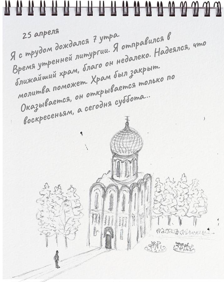 Я с трудом дождался семи утра. Время утренней литургии. Я отправился в ближайший храм, благо он недалеко. Надеялся, что молитва поможет. Храм был закрыт. Оказывается, он открывается только по воскресеньям, а сегодня суббота. Я еще час бесцельно слонялся по пустым улицам. Было тяжело. Особенно от ощущения того, что даже Бог сегодня не хочет меня впустить.