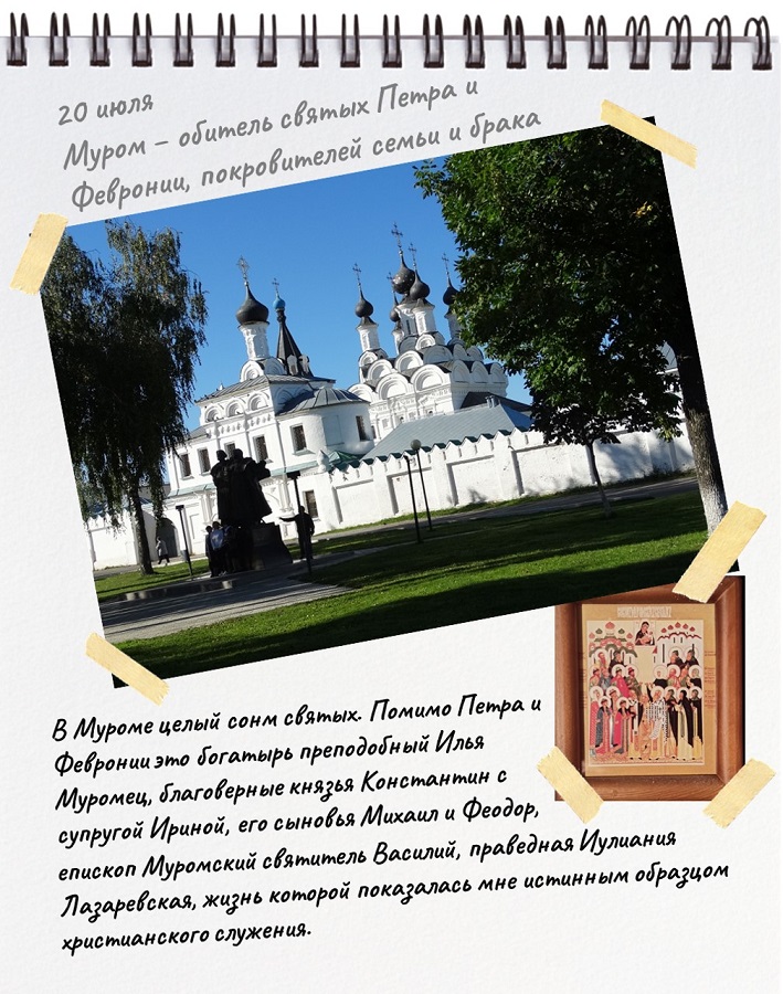 Настоящим удивлением было узнать, что в Муроме существует целый сонм святых. Помимо благоверных Петра и Февронии, а также былинного богатыря, а в конце жизни – Печерского монаха преподобного Ильи Муромца, были благоверные муромские князья Константин с супругой Ириной, его сыновья Михаил и Феодор, епископ Муромский и Рязанский святитель Василий, а также праведная Иулиания Лазаревская, жизнь которой показалась мне истинным образцом христианского служения.