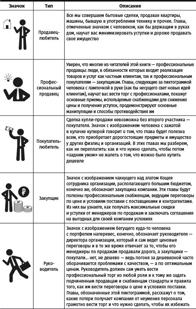 Эти значки показывают, для какого типа читателей будет в большей степени актуальна та или иная глава. В таблице ниже представлены основные сегменты целевой аудитории этой книги. Уверен, вы легко найдете свой тип и решите, главы с какими пиктограммами вам следует прочитать в первую очередь.