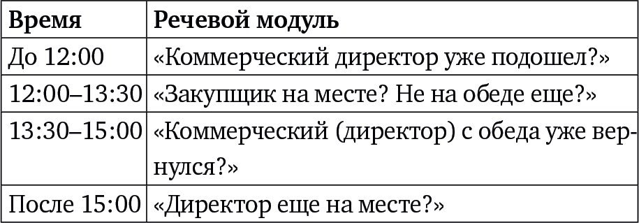 Совет. Звоня на производственные предприятия, смещайте время на один-два часа раньше (у них рабочий день обычно начинается с 8:00). Также при использовании этого приема нужно учитывать разницу в часовых поясах.