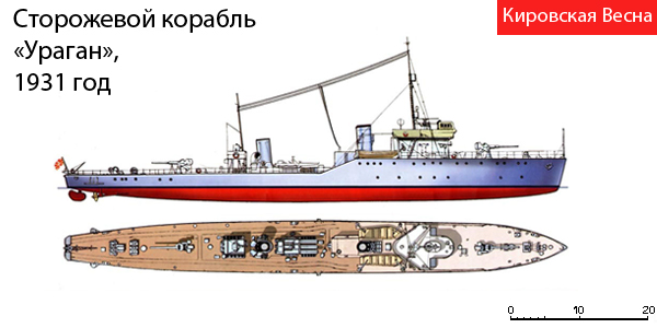ТТХ СКР типа Ураган на начало 1941 года: Водоизмещение 633 тонн, скорость 20 узлов, Вооружение: 2х1 102-мм, 2х1 45-мм, 3х1 37-мм орудия, 1х3 450-мм торпедный аппарат обр.1913, 2 бомбосбрасывателя, 34 глубинных бомб Б-1, 20 малых глубинных бомб М-1, 21 мина.
