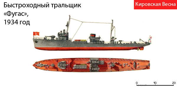 ТТХ тральщика типа Фугас на начало 1941 года: Водоизмещение полное 535 тонн, скорость 17 узлов, вооружение 1х1х100-мм Б-24БМ, 1×37-мм 70-К, 2х12,7-мм ДШК.