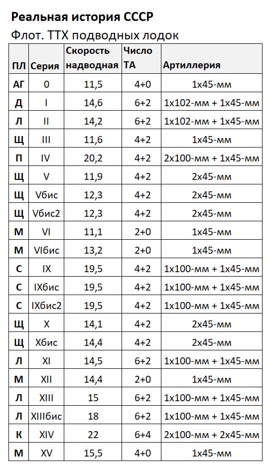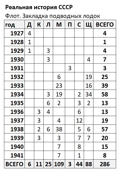 С 1927 по 1941 год в СССР по семи разным проектам было заложено 286 подводных лодок: Декабрист (Д): 6; К (Крейсерская): 11; Ленинец (Л): 25; Малютка (М): 109; Правда (П): 3; С (Средняя): 44; Щука (Щ): 88.