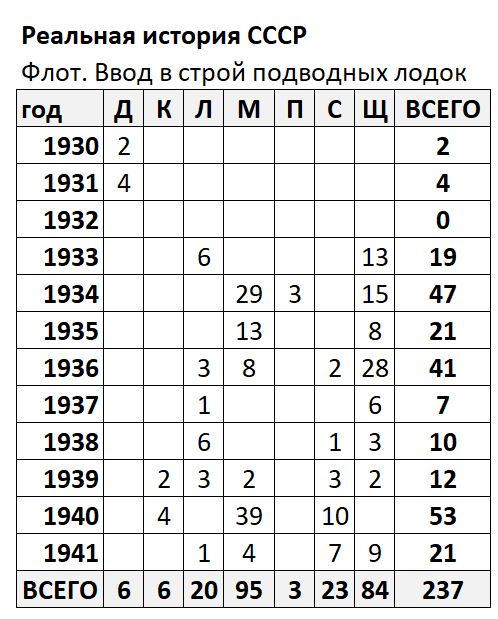 Из них вошли в строй до 1941 года включительно 237 подводных лодок, дополнительно к 5 подводным лодками типа АГ и нескольким учебным подводным лодкам типа Барс: