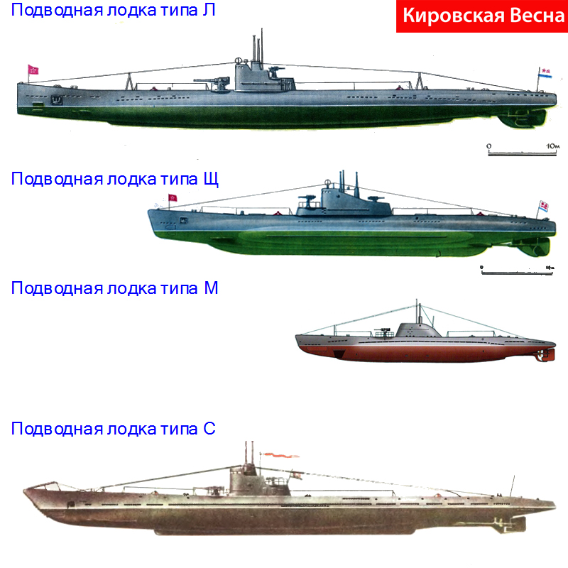 При этом самыми массовыми подводными лодками в составе ВМФ СССР явились 95 малых подводных лодок типа Малютка, 84 средних подводных лодок типа Щука, 23 средних подводных лодок типа С и 20 подводных минных заградителя типа Ленинец.
