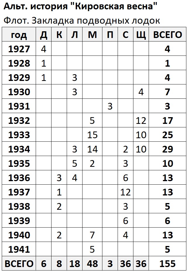 Таким образом, в альтернативной реальности «Кировская весна» суммарно с 1927 по 1941 году по семи разным проектам было заложено 155 подводные лодки: Декабрист – 6; К – 8; Ленинец – 18; Малютка (обоих вариантов) – 48; Правда – 3; С – 36; Щука – 36: