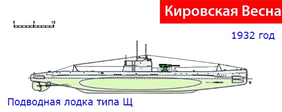Средняя подводная лодка типа Щ; Vбис серия; Годы строительства: 1932-33; Водоизмещение надводное: 592 тонны; Водоизмещение подводное: 716 тонн; Скорость надводная: 12,3 узла; Скорость подводная: 8,5 узлов; Число 533-мм носовых и кормовых торпедных аппаратов: 4+2; Артиллерийское вооружение: 1x102-мм.