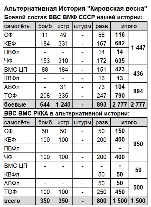 В Альтернативной реальности «Кировская весна» в боевом составе ВВС ВМС РККА 1500 боевых самолётов (бомбардировщики и торпедоносцы, истребители, разведчики), а также 900 иных самолётов (учебные, учебно-тренировочные и транспортные).