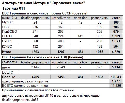 Как в нашей реальности на Восточном фронте (от Белого моря до Черного), так и в альтернативной реальности «Кировская весна», число боевых самолетов СССР 22 июня 1941 года превосходит число боевых самолетов Германии и ее союзников не только в целом на театре военных действий, но и в каждом военном округе по отдельности. При этом отдельные цифры носят отчасти условный характер. К примеру, советские самолеты Краснознаменного Балтийского флота оперировали как в ЛВО, так и в ПрибОВО. Что касается немецких самолетов 2-го воздушного флота, то и они в первые дни войны частично оперировали не против ЗапОВО, а против ПрибОВО.