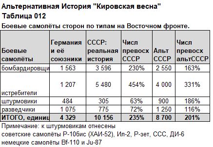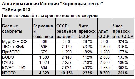 В альтернативной реальности «Кировская весна» на Восточном фронте (от Белого моря до Черного) число боевых самолетов СССР составляло 201 процент от числа боевых самолетов Германии и ее союзников.