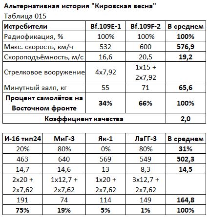 В альтернативной реальности «Кировская весна» истребителей И-15, И-15бис и И-153 в 1941 году в советских войсках нет. СССР имел на Западном ТВД в 1941 году всего 4000 истребителей, в том числе 3012 И-16 (75% от самолетного парка истребителей на Западном ТВД), 750 МиГ-1/3 (19%), 200 Як-1 (5%) и 38 ЛаГГ-3 (1%).