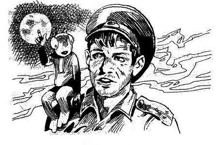 С этими словами капитан Краснобаев прибавил скорость и попытался улизнуть от черного цилиндра. Каково же было его удивление, когда он через несколько минут снова увидел этот самый цилиндр прямо у себя под левым крылом. И это удивление стало еще сильнее, когда он увидел, что цилиндр вовсе не цилиндр, а маленький космический корабль с круглыми иллюминаторами. В самом большом иллюминаторе сидел маленький зелененький человечек, похожий на лягушонка, и смотрел на Краснобаева.