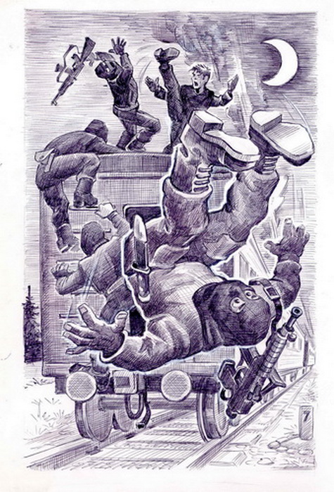 Но пока Иван Иванович с ними дрался, остальные уже все на крышу влезли, друг другу помогли и разобрались, что в их планы вмешался противник. Увидели они Краснобаева и огонь по нему из автоматов открыли. Краснобаев упал и прижался к крыше, а рядом с ним пули о железо гремят. Выстрелов самих то и не слышно. Видимо у бандитов автоматы с глушителями. Да и поезд тоже громко едет, колесами стучит.