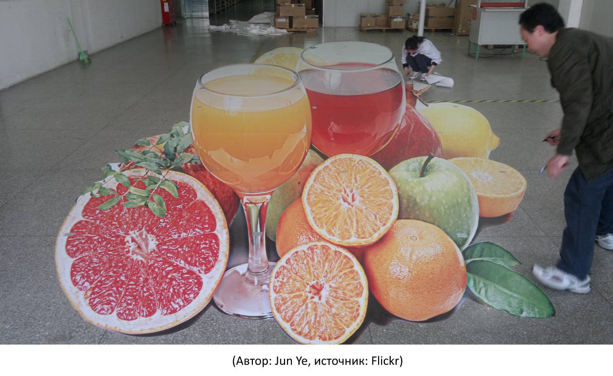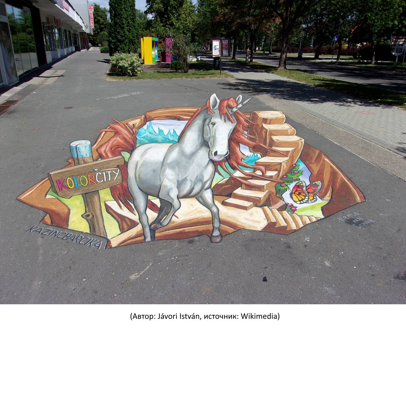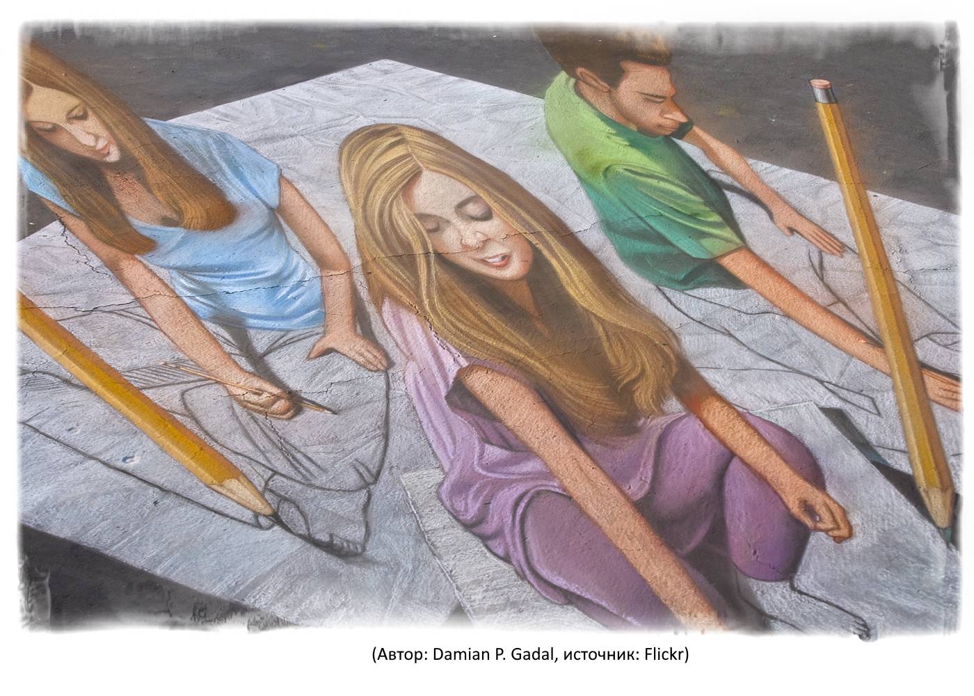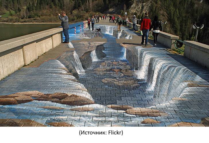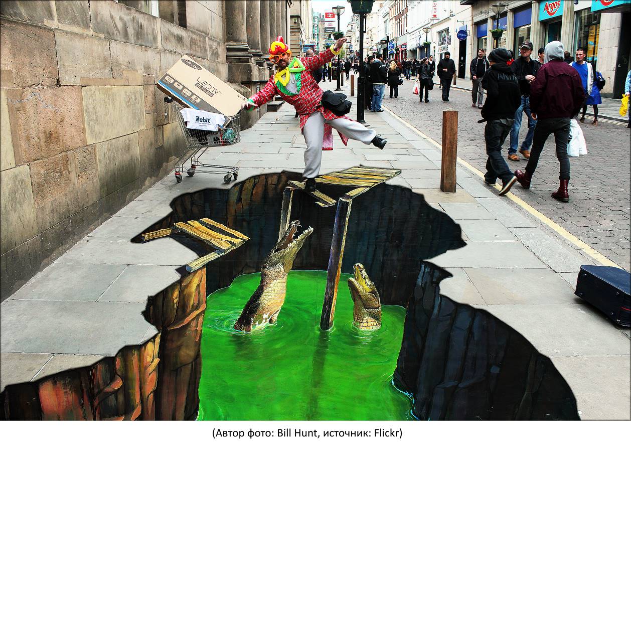 Разновидность 3D-технологий (или, если хотите, 3D-искусства), о которой пойдет речь, не относится непосредственно к области стереоскопического фото, видео или ТВ. Однако все же эту область она затрагивает: ведь цель создания 3D-композиций на асфальте тоже связана с объемным видением. Только здесь вместо использования левого и правого кадров стереопары, демонстрируемых, соответственно, левому и правому глазу, чтобы «обмануть» мозг и заставить его воспринимать плоское изображение как объемное, используется физика и… немножко иллюзии.