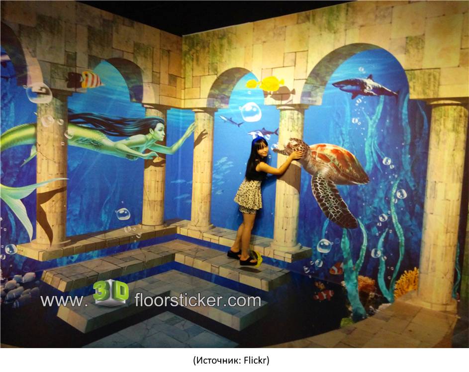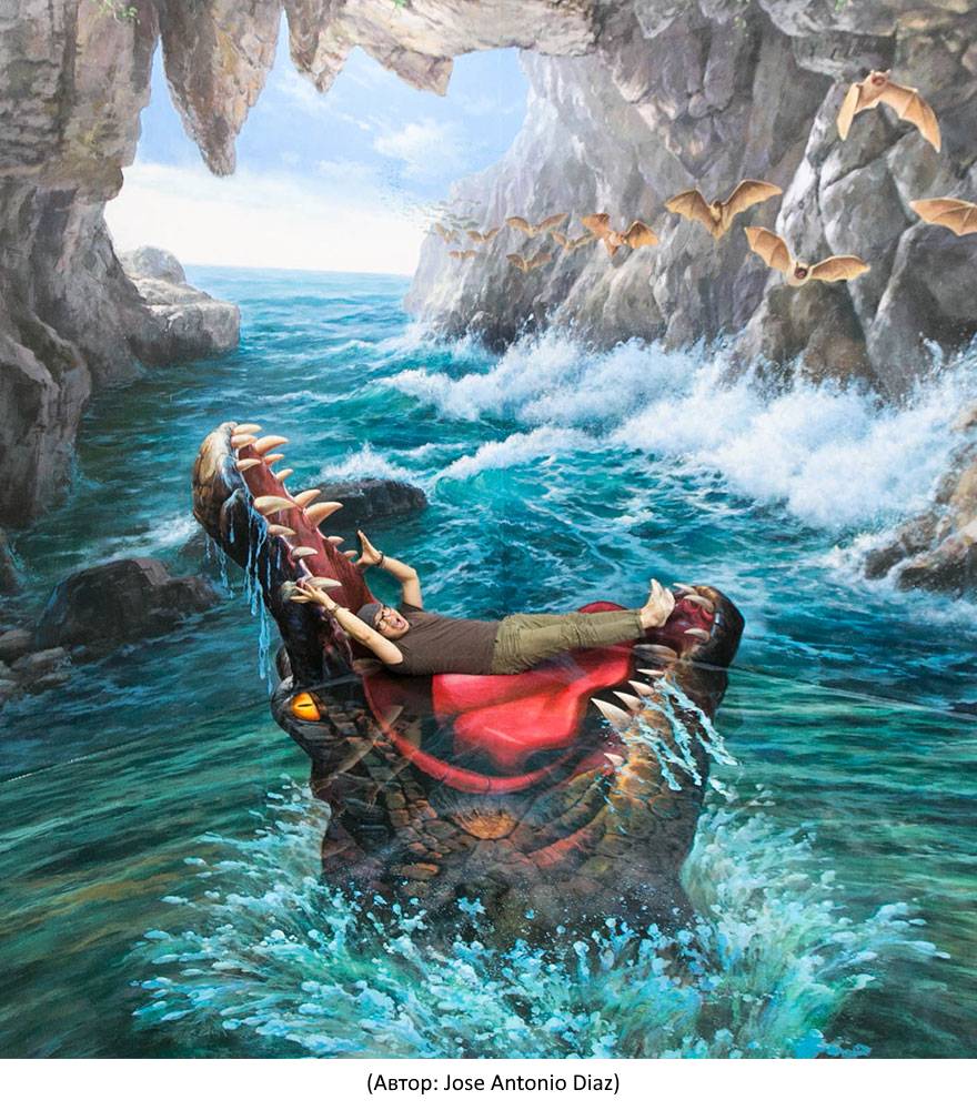– лучше всего эффект «объемности» картинки проявляется, если с ней на снимке соседствует действительно реальный, объемный объект (какой-либо предмет или человек): мозг в этом случае сам «достраивает» впечатление объема. Не зря на самых эффектных фотографиях 3D-арта обычно кто-то позирует.