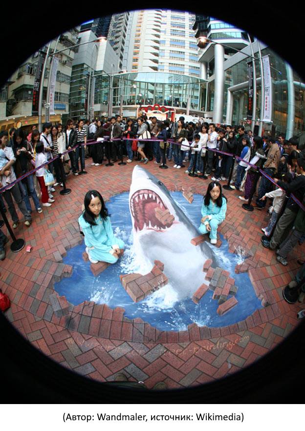 – смотреть (из «правильной» точки – с заранее рассчитанного расстояния до рисунка на асфальте и с заранее рассчитанной высоты!) нужно одним глазом, а еще лучше – рассматривать уже «плоский» фотоснимок, сделанный с требуемой точки: если смотреть двумя глазами, то стереоскопическое зрение легко справляется с «обманом» и разрушает иллюзию объемности картинки;