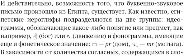 Не исключено, что иностранец, знакомый с египетскими иероглифами, мог использовать этот принцип для создания собственного письма. Здесь к месту будет вспомнить легендарного еврейского пророка Моисея, научившего евреев писать, который, по преданию, воспитывался в семье египетского фараона. Правда, не совсем понятна в связи с этим графическая форма семитских знаков. Они как-то мало похожи на свои египетские прототипы. Либо изобретатель семитского письма использовал только сам принцип, а форма знаков была принята им, исходя из местных реалий, либо она претерпела довольно значительные изменения с течением времени. В последнем случае где-то должны были сохраниться надписи, содержащие переходные формы. Вполне может быть, что к таковым относятся так называемые протосинайские символы. Знаки гублского (библосского) слогового письма также производят впечатление чего-то среднего между египетскими иероглифами и семитскими буквами. Однако, учитывая все вышесказанное о трудности перехода от слоговой письменности к звуковой, очень сомнительно чтобы оно было предком семитского алфавита. Скорее наоборот – предок семитского письма был прообразом для гублского. Доказать или опровергнуть все это невозможно, поскольку обе эти письменности до сих пор не дешифрованы.