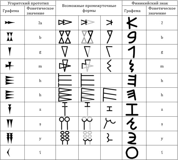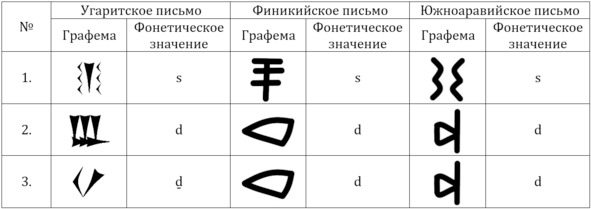 Предположим, что одна из этих вышеперечисленных систем письма и является прототипом для всех остальных. Но какая? Если судить по датировке, то ею, скорее всего, должна бы быть протосинайская. Бирюзовые рудники, где были обнаружены фрагменты этого письма, эксплуатировались лишь трижды: в XVIII, XVII—XVI и XV веках до н. э. Соответственно, к какой-то из этих дат и следует приурочить их нанесение. Самые ранние из протоханаанских надписей датируют XVI веком до н. э., а угаритских – XV веком до н. э. Старейшую финикийскую граффити на гробнице царя Ахирама относят к 1000 году до н. э. (есть и другие версии датировки), несколько моложе южноаравийское письмо. Однако в ситуации, когда каждая новая находка может существенно «состарить» любую из этих систем, датировка уже не может играть решающей роли. Обращение к письменным источникам также особых результатов не дает. Древние авторы отдают первенство в изобретении буквенно-звукового письма то египтянам (протосинайское или протоханаанское письмо, как переходная форма), то финикийцам, то сирийцам (Угарит – сирийский город). Здесь мы имеем прочный паритет. Правда из гонки отсеивается явный аутсайдер – южноаравийский алфавит. Но какой из оставшихся четырех появился раньше остальных? Небольшая зацепка появляется при сравнении графической формы знаков. Из табл. 2 хорошо заметно, что символы для звука s финикийской, угаритской и южноаравийской письменностей имеют общее происхождение. Но самое интересное здесь то, что без угаритской графемы оно никак бы не просматривалось! И, следовательно, первоисточником в этой тройке может быть только она! Другой пример, не менее красноречивый – знаки для звука d. Если посмотреть на вторую графу, то вроде бы особого родства не видно. Но заменив угаритский делет на знак для d (третья графа), мы заметим, что оно становится достаточно явным. И это находит вполне естественное объяснение из истории развития угаритской фонетической системы, в которой интердентальный d в отличие от других семитских языков переходит в зубной d.
