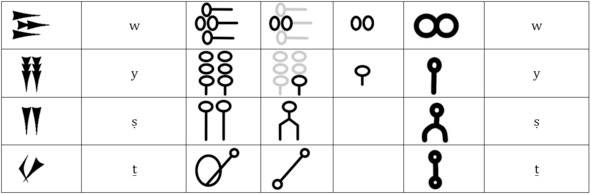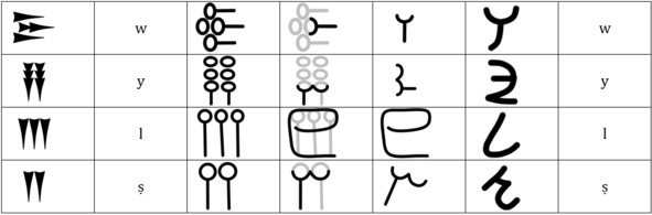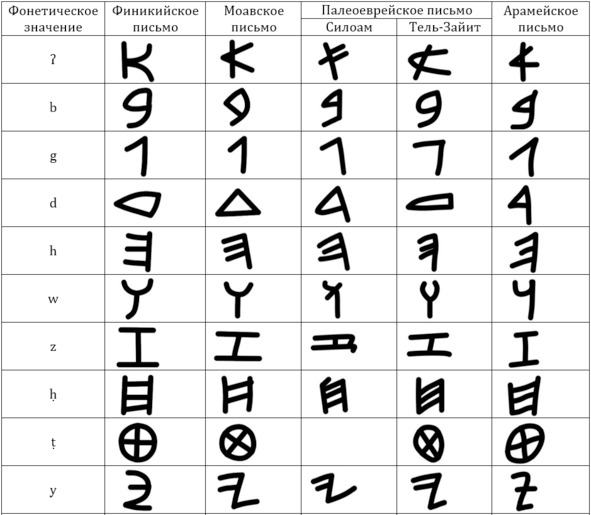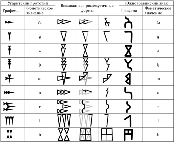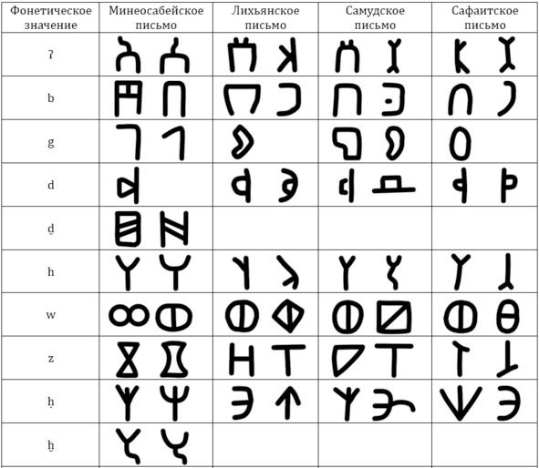 Таблица 11. Сравнение формы некоторых знаков южноаравийского алфавита.