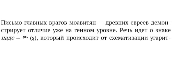 Очень близким по форме к финикийскому является письмо моавское, известное нам по двум надписям: пространной стеле царя Меши и небольшом фрагменте, обнаруженном в Вади Эль-Кераке. На стеле царя Меши повествуется о победоносных войнах этого правителя против Израиля. Имя это ученым уже было известно из четвертой книги Царств: «Меса, царь Моавитский, был богат скотом и присылал царю Израильскому по сто тысяч овец и по сто тысяч неостриженных баранов. Но когда умер Ахав, царь Моавитский отложился от царя Израильского»8. Далее рассказывается о военной экспедиции, организованной царями Израиля, Иудеи и Эдома против этого мятежного монарха. Запертый в осажденной врагами крепости Кир-Харешет, Меша в отчаянии принес в жертву богам своего старшего сына. Странно, но после этого израильтяне действительно отступили.