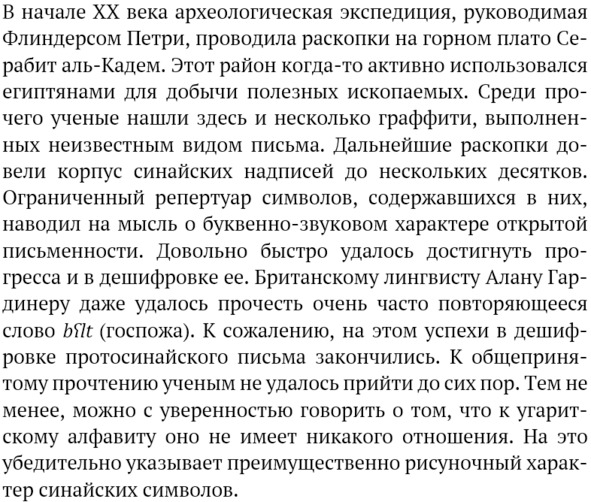 Письменные фрагменты II тысячелетия до н. э., найденные в Палестине, обычно объединяют под обобщающим термином протоханаанское письмо. Самые древние относят к XVIII—XVII векам до н. э. Все они до сих пор не имели общепризнанной, устраивавшей всех дешифровки, благодаря чему эта глава может стать моментом истины для моего предположения. Ведь если нам с помощью гипотезы об угаритском письме как предке всей буквенно-звуковой письменности удастся прочесть хотя бы одну из них, то этот факт станет веским аргументом в пользу его. И тогда можно будет считать, что оно по крайней мере имеет право на жизнь. По логике с этого места к работе требовалось бы, конечно, привлечь профессионального семитолога или лингвиста, но среди моих знакомых таковых не оказалось, так что пришлось обходиться своими силами. Согревает душу мысль – если повезет, и книга привлечет внимание значительного числа читателей, то критики обязательно найдутся и на ошибки мне укажут.
