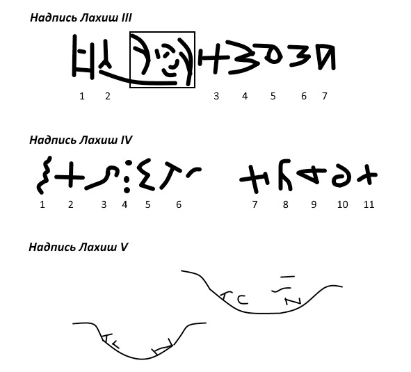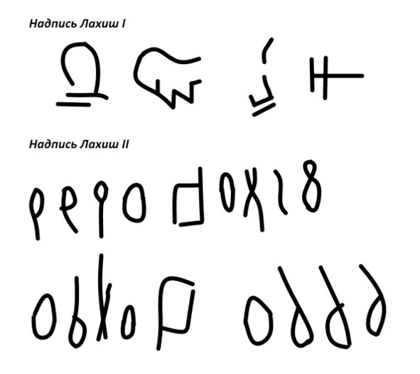 Еще одна надпись, найденная в Лахише (Лахиш V), была когда-то выцарапана на крышке курильницы (привожу две разные зарисовки). Сохранилась она плохо, и прочесть здесь что-либо будет очень трудно.