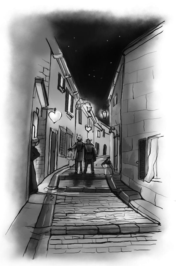 После следующей таверны Филь обратил внимание, что Эша здорово похорошела на свежем воздухе. Её большие серые глаза, глядевшие на него из-под капюшона, сияли. Как и фонари на ближайшей улице, где Ирений вдруг провалился куда-то будто сквозь землю, а Эша потащила Филя за собой, схватив его за руку, желая что-то показать.