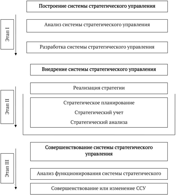 Автор считает необходимым, включит в логическую цепочку третий этап: «совершенствование системы стратегического управления», содержащий подпроцессы «Анализ функционирования системы стратегического управления» и «совершенствование или изменение ССУ». Данный шаг становиться желательным при появлении стратегических неожиданностей, изменений и позволяет произвести комплексную оценку и анализ функционирования системы стратегического управления. Этап 2 целесообразнее расширить подпроцессами влияющими на осуществление стратегии. Процесс «стратегического контроля» в рамках второго этапа включить в совокупность выполняемых в ходе формирования и реализации стратегических функций: стратегического планирования, стратегического учета и анализа. В данном случае рассматривается формирование стратегического управления, используя процессный подход.