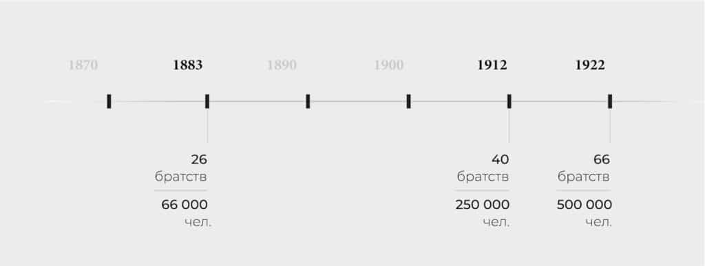 Зародившись в первой половине XIX в., «греческие буквы» распространялись на всю систему высшего образования в три основные волны, которые мы рассмотрели выше. К началу XX века «греческие буквы» увеличились в количестве и усилили свое влияние. Если в 1883 году существовало 26 братств, а количество членов было около 66 тысяч, то к 1912 году насчитывалось более 40 братств с количеством членов, превышающим четверть миллиона. А к 1922 году в стране было 66 студенческих братств с более чем 2 тыс. филиалов и более 500 тыс. членов[134].