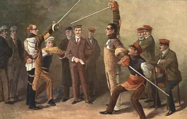 Георг Мюльберг. Гайдельберг. Студенческая дуэль на саблях. (Мензурное фехтование), ок. 1900 г. Изображение находится в публичном доступе.