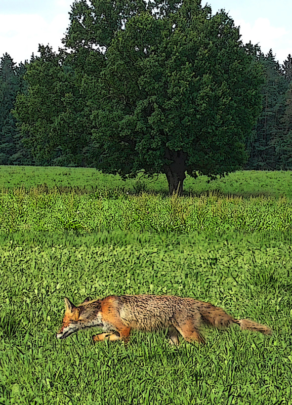 За полями и лугами,Где-то там в густом лесу,Живет лисица молодая.Как только утро наступаетОна выходит на охоту:Вначале в лес, а после в поле.И тут мне стоит вам сказать,Что мало опыта имеетИ редко удается ейПоймать полевку или птичкуНа том огромном поле,Где с краю там растут дубы.Туда же рано утром,Как только солнышко взойдет,Слетаются все птицы.Там на деревьях с краю поля