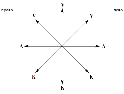 • Если его руки двинулись влево или вправо по горизонтали либо собеседник находится в позе саксофониста, значит, его сознание в этот момент времени обрабатывает звуковые сигналы (A).