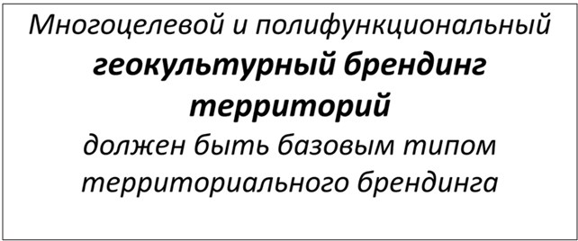 Геокультурный брендинг территорий не является традиционным брендингом территорий, который существует в западных маркетинговых и брендинговых форматах и развивается сейчас на российской почве. Это деятельность, которая связана с культивированием образов территорий, важных для сплочения территориальных сообществ. Она может быть некоммерческой или коммерческой, но, так или иначе, главная цель геокультурного брендинга не может быть изначально коммерческой, она ориентирована не на получение прибыли, а на развитие идентичности городских (и шире – территориальных) сообществ и на те события, которые актуализируют образ города. Геокультурный брендинг территорий проявляется проявляется прежде всего в современном искусстве, туризме, в интерактивной культуре и в креативной индустрии. Но выбор в направлении развития геокультурного брендинга всегда остается за городом и его основными сообществами.