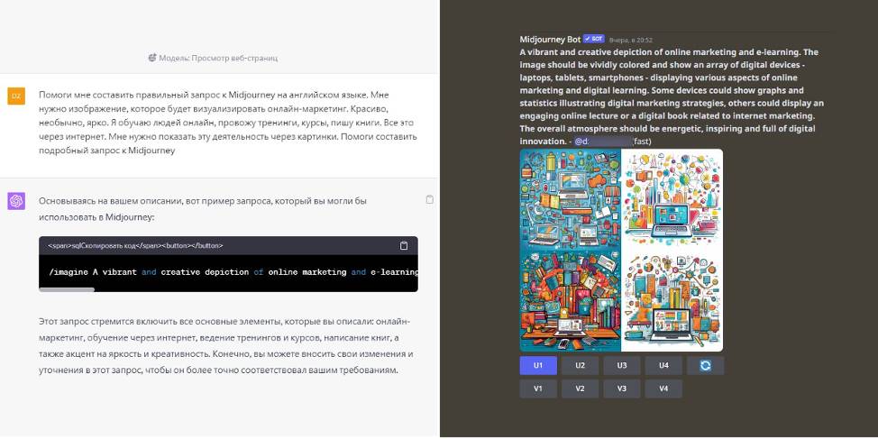 3) в ChatGPT вы описываете стоящую перед вами задачу – что хотели бы визуализировать и просите сделать запрос для Midjourney