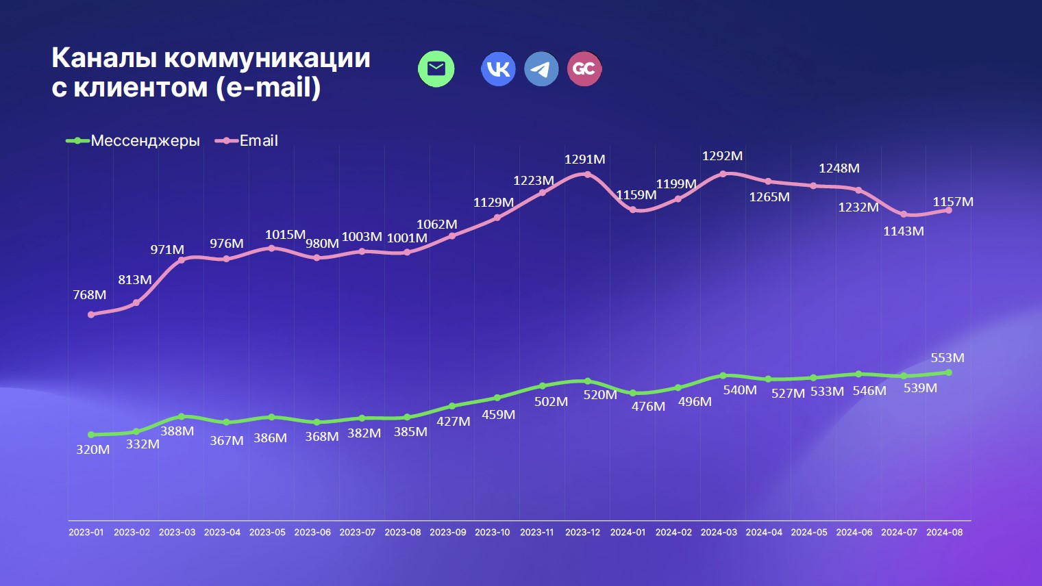 Как вы видите – email все еще существенно опережает мессенджеры по объему коммуникации.