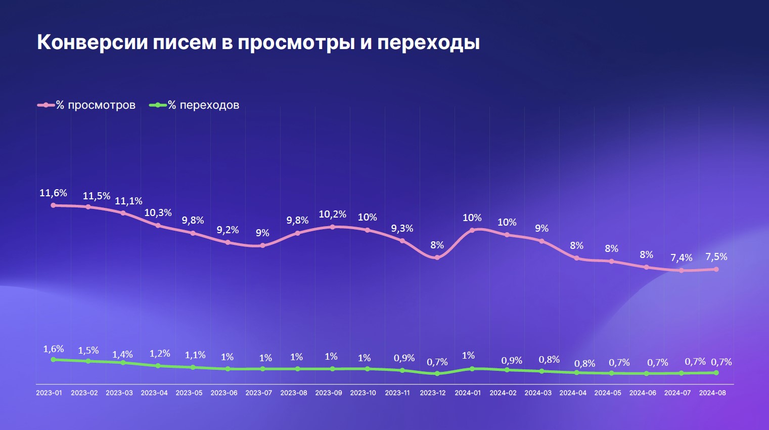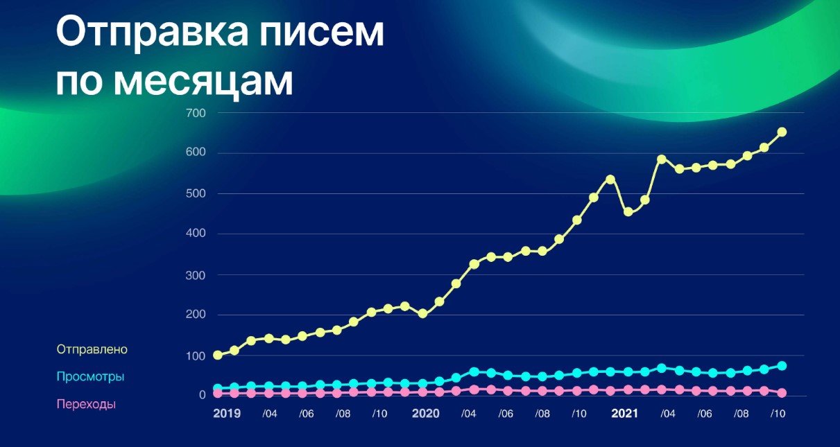 Здесь видно, что количество отправляемых писем каждый год растет, а их открываемость снижается. Это закономерно, но не стоит забывать – цифры средние.